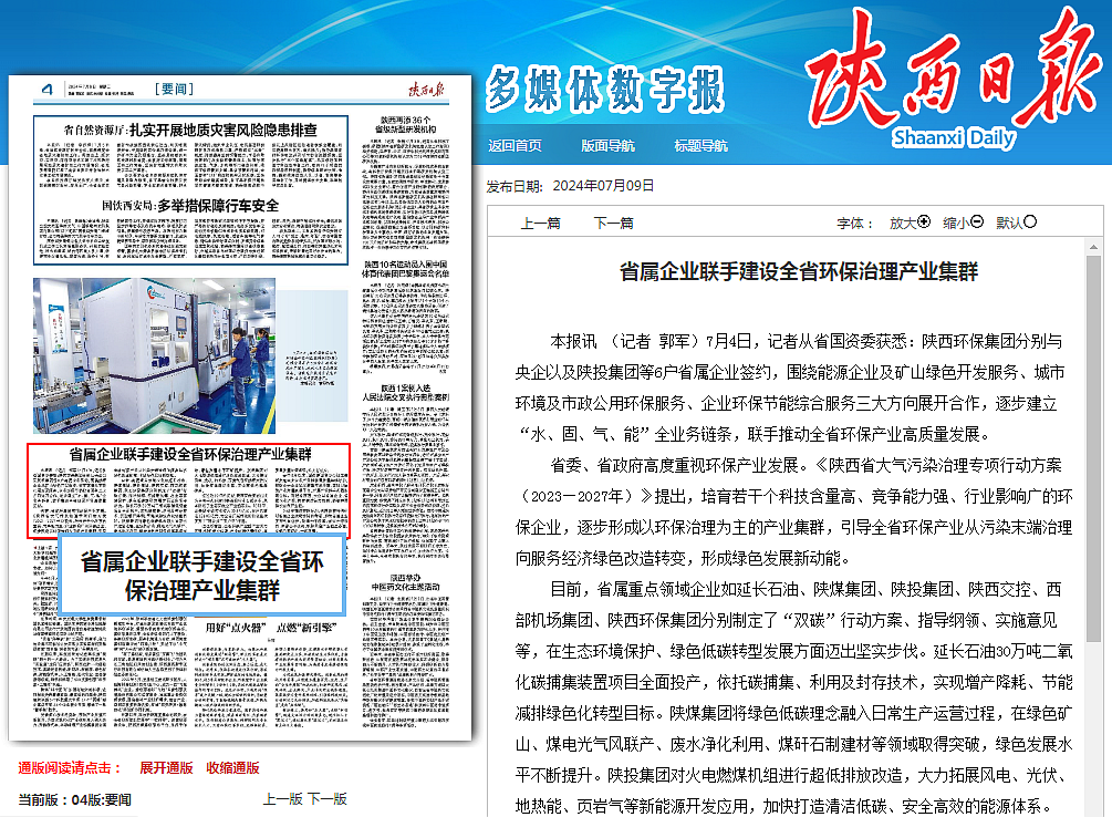 7月9日,陜西日報以《省屬企業(yè)聯(lián)手建設(shè)全省環(huán)保治理產(chǎn)業(yè)集群》為題,對陜西環(huán)保集團(tuán)舉辦陜西國企生態(tài)環(huán)保業(yè)務(wù)合作座談會和服務(wù)全省環(huán)保產(chǎn)業(yè)鏈發(fā)展等情況進(jìn)行了報道。現(xiàn)刊載如下,以饗讀者。